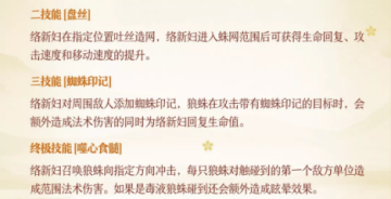 二技能则是盘丝,络新妇在指定位置盘丝结网,在网中的话,就可以获得生命恢复以及攻击速度和移动速度。
