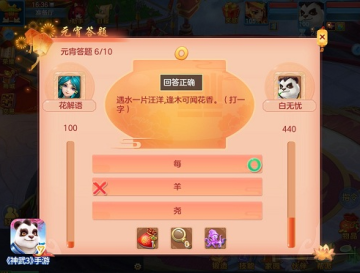 欢庆闹元宵,喜乐猜灯谜。作为开年第一个热闹的传统节日,《神武3》手游为元宵节量身打造了众多极富节日特色的活动玩法,其中精彩纷呈的灯谜大会最受关注。活动期间,各位少侠随机两两匹配进入答题界面,以十道灯谜为一轮,连续答题获得活动积分,最后活动积分最高者获胜。