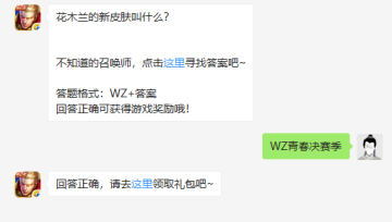 作者:网友整理 人气:0花木兰的新皮肤叫什么?不知道的召唤师,点击寻找答案吧~答题格式:WZ+答案回答正确可获得游戏奖励哦!又到了每天的王者荣耀每日一题时间了,今天给玩家带来的是王者荣耀花木兰新皮肤的问题,很多玩家都听过花木兰要出新皮肤了,但是花木兰新皮肤是什么呢?很多玩家就不是特别了解了。今天小编便给大家带来王者荣耀在花木兰新皮肤叫什么的问题的回答,一起来看看吧。