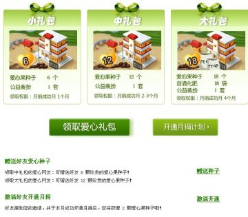 活动内容:凡于1月1日-31日开通或续捐“月捐计划”的爱心网友,都可根据月捐成功月的不同,领取QQ农场独家奉献的爱心果礼包1份。