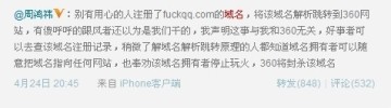想当初2010年的3Q大战,腾讯和360打得那叫一个惨烈,突然半路杀出一个fuckqq.com,打开后竟然指向360官方网站,不能不让人联想和360有关。