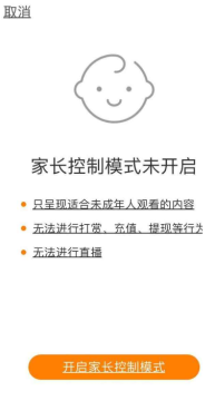 点击按钮进入功能界面,列有“适合未成年人观看的内容,无法进行打赏、充值、提现等行为,无法进行直播”等三条说明。
