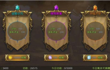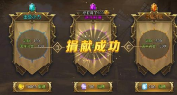 勇士们点开国家界面,点击“捐献”即可进入国家捐献界面哦~在这里,勇士们可以选择3个档次的捐献方式。分别是:金币、绑定紫钻、宝钻。每个档次所能获得的功勋值和国库资金也各不相同~勇士们可以根据自己的情况,选择适合自己的方式哦~