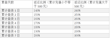 (2)内测期间充值总金额大于500元且小于等于10000元,公测后根据内测累计登录天数最高可获得300%(内测期间累计登录不少于1天返还240%,每多1天,返还增加10%,最高300%)元宝返还;