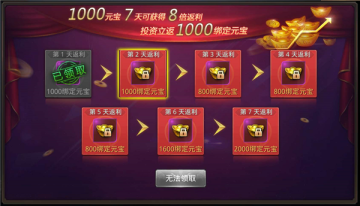 活动内容:投资1000元宝,立领1000绑定元宝,7天总计领取8000绑定元宝。