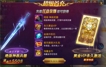 +10绝版神装兵器*1,黄金VIP永久激活,首充感恩大礼包*1