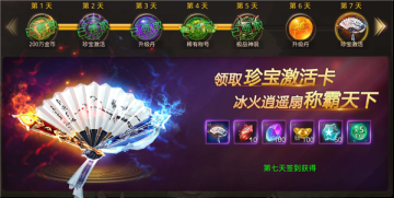 第七天:珍宝·冰火逍遥扇、麒麟臂进阶石*10、宝石碎片*100、绑定元宝*100、升星宝石*50、5倍经验丹*1