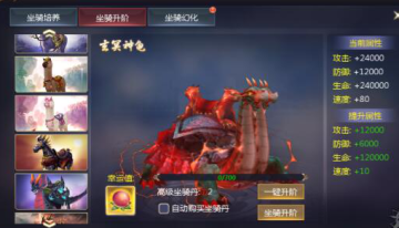 玩家在游戏中升级到一定等级,开启坐骑功能。点击右上角玩家头像,屏幕下方弹出功能键,点击“坐骑”进入到坐骑的界面。提升坐骑的方法有两种,第一种则是坐骑培养。第二种是坐骑升阶。