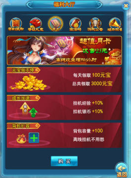 4. 挂机几乎是最普通最慢的升级,但是可持续性很高,所以月卡这重要性也可见一斑~月卡可以提升10%的经验,日积月累四舍五入那就是几个亿啊,玩这游戏不买张月卡怎么玩~?