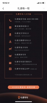 官方介绍,为了保障用户体验,礼橙专车成立了独立客服热线,提供24小时中英文服务。此外,升级黄金服务标准2.0,譬如提供更多的出行服务装备:一次性雨衣、空气净化器、按摩椅等。
