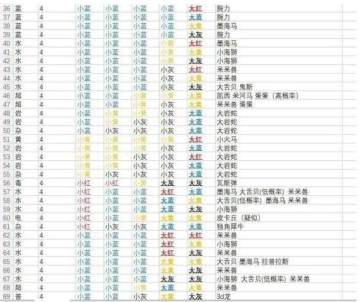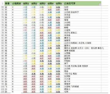 注意,这图片只是参考作用,不要迷信,例如大岩蛇图片中有很多大材料,但大岩蛇只需一个大蓝,三个小黄,一个小灰就百分之百出货,所以大家刷精灵时尽量用更少的大材料来刷出想要的精灵。