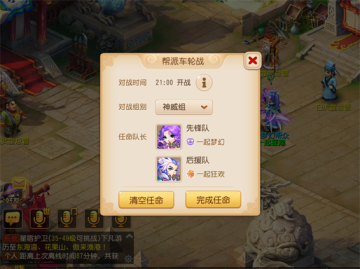 1.由帮主/副帮主在准备时间进行车轮战布阵,选择一个组别并任命两个符合该组别要求的玩家为队长,且被任命的玩家必须为队长;