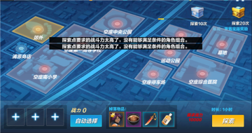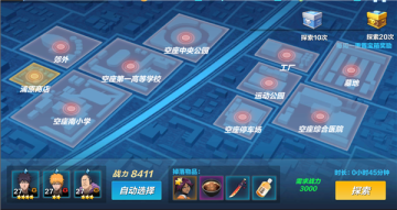 探索玩法中,包含着很多的地图,从浦原商店开始,到郊外、空座南小雪、空座第一高等学校一直到控场、空座综合医院等多个地图,每次探索,需要排除三位人物卡牌出战,且三张卡牌的战力总和要超过探索所需的战力,探索时常随着地图的深入而增加,时间结束之后,可自动获得奖励。