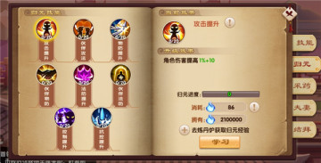 学习归元技能,可以增强主角和伙伴的攻击,防御和控制等属性