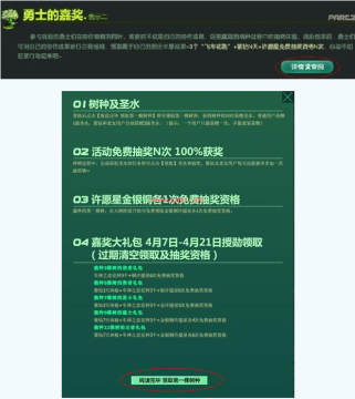 参与活动的勇士们在栽树的同时还能享受到免费的转盘抽奖,只要当日完成获取圣水的任务后半个小时到1个小时内,即可返回到《勇士栽树·重建圣地》 页面直接点击【领取】按钮,就可领取对应次数的转盘抽奖资格,可即时去抽奖,抽取到的游戏道具直接发送至您报名绑定的游戏大区帐户;如不即时去抽奖,抽奖资格将记录在登陆的个人信息面板中,如您有1次以上的抽奖资格,在登陆活动页面后将收到可抽奖提示;紫钻及老友用户在完成四项任务中的任意任务,则每天可独享多加一次抽奖,如:普通用户当天完成了4个任务,将获赠4次抽奖,而紫钻及老友用户当天则获赠5次抽奖;在完成四项中的任意任务后,紫钻贵族和老友用户每天只能加赠一次,不能重复加赠。获取抽奖资格的每个任务每个用户每天只能完成一次。