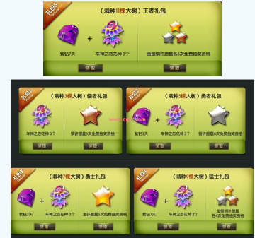 3月16日到4月6日期间,勇士们奋力栽种飞车精灵树,4月7日开始为栽种不同数量精灵树木的勇士们发放终极大奖,直接登陆《勇士归来·授勋嘉奖》 页面后,根据个人信息面板中显示的当前大树数量,去领取对应的礼包大奖,领取紫钻和花种后,请分别查收QQ帐户提示,和前往QQ农场【我的物品包】中查收;领取许愿星免费抽奖资格后,即可跳转到抽奖页面可消耗对应数量的许愿星抽奖,消耗掉赠送的免费抽奖资格量后的抽奖费用均需用户自行承担。每个用户只能领取一个礼包,取栽种树木的最大值领取,如栽种有10棵大树,只能领取【礼包4】