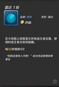 使用场景:这个道具的存在,使得追捕者更加强大,本就有一个很短CD的传送,再搭配上雷达……
