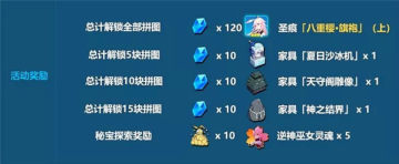 2)完成特定任务可以获得奖励并解锁一块拼图,累计解锁一定数量的拼图可获得水晶、家具「夏日冰沙机」、家具「天守阁雕像」、家具「神之结界」等奖励~