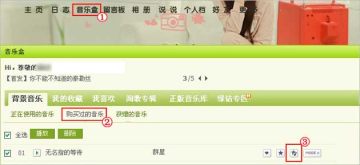 登录QQ空间点击导航条上“音乐盒”,在背景音乐页面右边点击“购买过的音乐”,若您成功购买过的QQ音乐会显示出来,点击“设为背景音乐”(按钮: