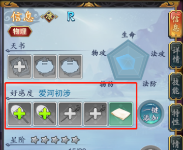 好感度收集完成可一件穿戴,全部缠带满后,则可以直接对目前好感度做升级,升级后,武将高阶技能会依次开启;