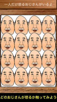 游戏的玩法非常的简单,就是通过点击屏幕中的老头,然后最后一个你会发现和其他的不一样。因为在里面有一个是会生气的欧吉桑,那么这款游戏也是在聚会的时候很受欢迎。