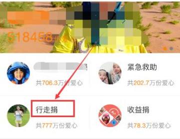 2、进入“爱心捐赠”页面后,我们可以看到在此页面有儿童月娟、紧急救助、行走娟以及收益捐四个区域,我们点击“行走捐”按键。