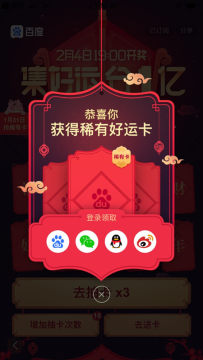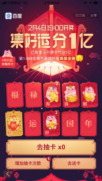 作者:网友整理 人气:0马上就临近新年了,百度开始了一个集好运卡的活动,一直持续到2月4号。不仅能分的奖金,还有机会获得限量金猪。一起来看看吧。