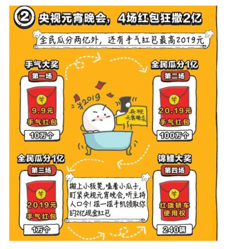 随后登场的就是央视元宵晚会的4轮红包专场,具体每场的上线时间将跟随晚会的节奏调整,用户可以根据活动页面上的倒计时预告信息以及央视元宵晚会的主持人口播提示,及时了解活动时间并参与。央视元宵晚会红包专场共包含4轮,其中第2场和第3场将各提供1亿元的红包,除了随机金额红包之外,还分别包含100万个20.19元以及1万个2019元的手气大额红包;而第1场和第4场也会提供非常有吸引力的奖金及奖品,如随机红包、10万个9.9元的手气红包、240辆红旗轿车的使用权等。
