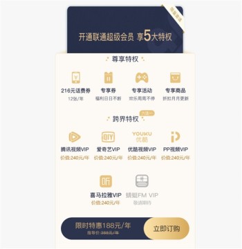 日前,中国联通推出了自家的“超级会员”,可享5大特权,指导价388元/年,目前限时优惠价188元/年。
