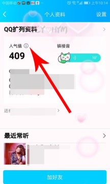 在对方的个人资料界面打开扩列资料板块时,点击人气值右侧的符号,位置见下图