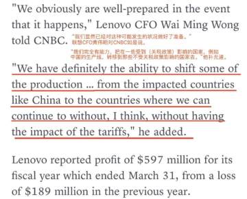 即“如果发生这种情况,显然我们已做好充分准备,”联想首席财务官黄伟明在接受CNBC采访时表示。“我认为,我们完全有能力将部分生产能力从中国等受影响国家转移到其他不受关税影响的国家,继续生产”。