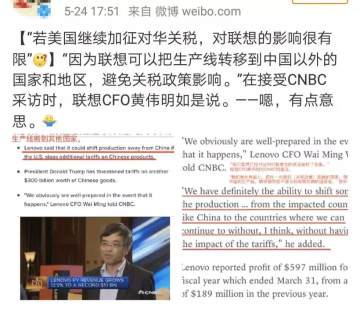 但在这条微博的号召下,大量媒体开始报道联想要因关税问题撤出中国。