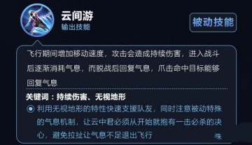 云中君气息调息完成后展翅飞行,增加移动速度的同时能够免受地形阻挡的影响,飞行期间云中君的普通攻击将会变为爪击,并撕裂目标,造成持续的流血伤害,目标被撕裂后将会受到额外的伤害效果;云中君进入战斗后将逐渐消耗气息,而脱离战斗后将会回复;爪击命中目标能够回复气息。