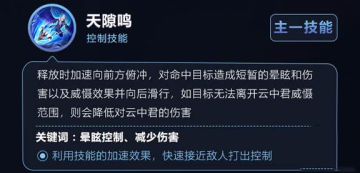 云中君振翅加速,向当前方向俯冲,撕裂目标后向后滑行,并对目标造成短暂的晕眩与物理伤害,俯冲能够威慑命中的目标,如果无法离开云中君一定范围,则会降低对云中君的伤害持续5秒。