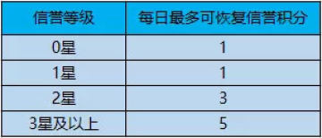 不同信誉等级每日可恢复的信誉积分不同,对低信誉等级的玩家做恢复信誉积分限制,规则如下: