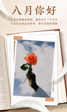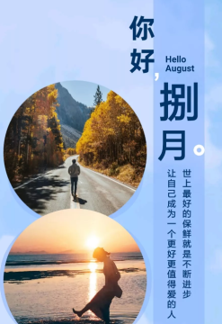 作者:强柔 人气:0导读: 八月你好,我要去努力完成伟大的事情啦,跟过去和七月统统说再见,加油鸭!从此刻起,莫负时光,七月再见,八月你好!