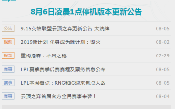 其实,如果你去官网就可以看到更新公告,9.15版本更新时间是在8月6日1点-12点,也就是说需要12点以后才能够玩LOL哦!