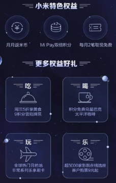 除了神秘酷炫的卡面设计,招行小米信用卡还为用户带来了专属权益福利。招商银行信用卡新用户申请并完成首刷,即可领取以下礼品(三选一):小米双肩包、蓝牙耳机、米家保温杯,领取后可在小米商城APP免费兑换。又如快捷支付礼,新户每月任意三周刷卡达标,叠加领取15米币;还有Mi Pay双倍积分,通过Mi Pay或小米钱包,支付享受双倍积分特权。在年费上,个人版首年免年费,校园版持卡有效期内无附加条件免年费。