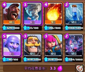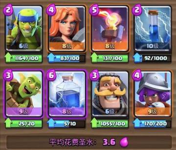哥布林投掷手,电击法术,地狱塔,女武神,哥布林飞桶,骑士,火枪手以及雷电法术组成的卡组,平均消耗只有3.6圣水,打法思路为使用低质量随从进行消耗,法术进行清场。