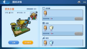 先别急,利用圆帽购买图纸之后,还需要使用材料拼砌各个建筑结构。以图纸“农夫小屋”为例,就需要拼砌地基、遮阳棚、屋顶、墙面四个建筑结构,每个结构都需要一定的零件,小伙伴可以对照搜集。