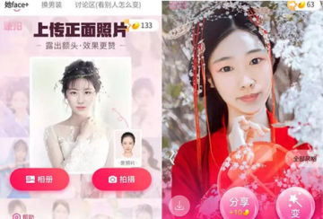 首先进入她拍首页,进入她face+功能界面,点击拍摄,通过相机拍几张适合古装造型的照片,选择正面拍摄。也可以选择相册中已有的图片进行变装。