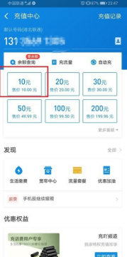 第三步选择好手机号之后,选择要充值的金额,这里选择10元,如下图所示: