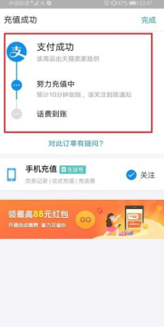 第五步验证密码之后,可以看到已经使用花呗支付成功了,等待话费到账,如下图所示: