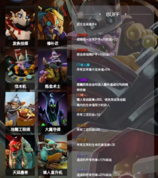 8人口时,理想状态是用炸弹人替换赏金,再加入飞机,6地精和6工匠的BUFF就会全部出现——6工匠是最新版本出现的BUFF,所有友军!注意,是所有友军生命回复速度+35,除了硬,回血更是变态!炼金开大每秒能回105血。
