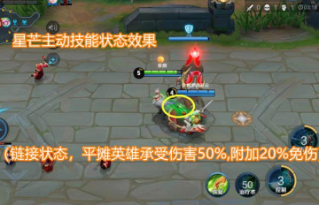 唯一被动-星芒:立即与周围血量最低的友方英雄建立链接,分摊其50%所受伤害。链接过程中为被链接方提供额外20%的伤害减免,链接在超过一定范围后会断开,持续2秒。冷却时间:45秒(备注:如本来队友会受到100点伤害,那么的最终伤害,先计算伤害减免20%,再计算50%分摊,最终队友受到伤害40,辅助因为分摊受到40点伤害。