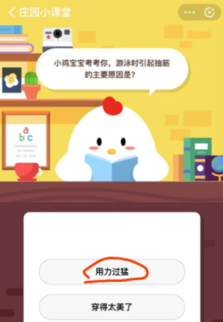 支付宝庄园小课堂11月18日的问题是,小鸡宝宝考考你,游泳时引起抽筋的主要原因是什么呢?想要知道正确答案的就和小编一起看下文吧。
