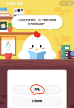 支付宝庄园小课堂11月23日的问题和答案已经出来了,问题是小鸡宝宝考考你,以下哪种动物被列为濒危动物?下面一起从文中看答案。