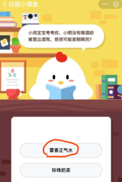 支付宝庄园小课堂12月2日的问题是,小鸡宝宝考考你,小明没有喝酒确被查出酒驾,它很可能是刚喝完什么呢?下文中为大家介绍正确答案。