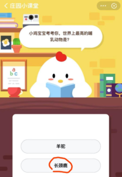 支付宝庄园小课堂12月22日的问题是,小鸡宝宝考考你,世界上最高的哺乳动物是什么?你知道吗?不清楚的看看文中正确答案,回答对事可以获得小鸡饲料的。