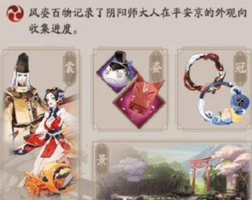 风姿百物系统入口位于'庭院'-'图鉴'中,记录了阴阳师大人在平安京的外观收集情况,包括:阴阳师皮肤、御灵皮肤、式神皮肤、庭院皮肤、结界皮肤、头像框、式神姿度、式神配饰、阴阳师动作效果、小动物配饰等。